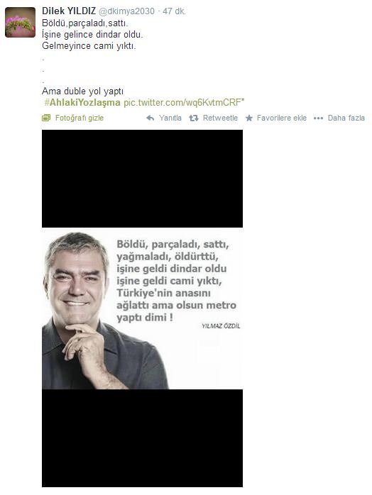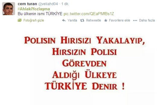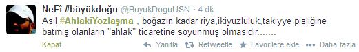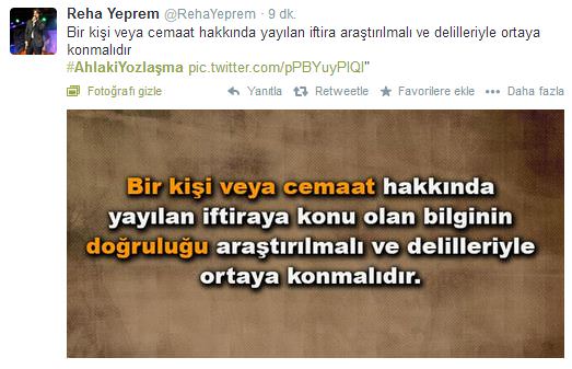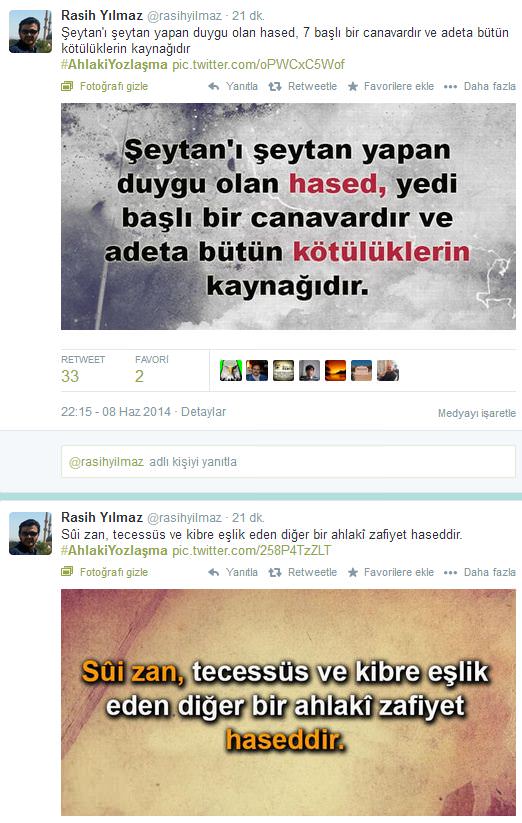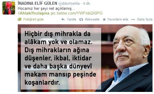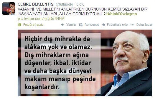 Twitter yaşanan bu son olay gösteriyor ki Fethullah Gülen Hareketi, dini kendi çıkar ve hevesatı için kullanan fakat bununla amel etmeyen, sürekli gösteriş peşinde koşan, erdemli olmayı deği laf cambazlığını tercih ne idüğü belirsiz bir nesıl yetiştirmeye çalışıyor...