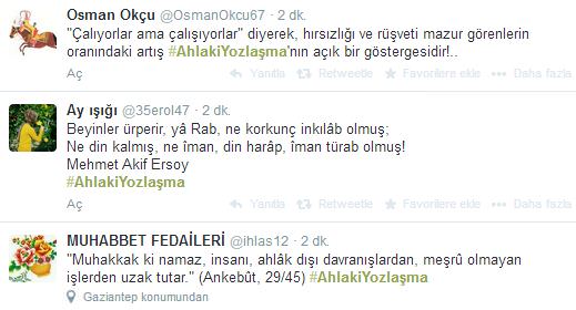 Gülen'in talimatıyla Twitter'da ajitasyona başlayan paralel yapı yandaşları, dini ve milli değerleri istismar eden tweetler attı. Twitter'dan ahlak dersi vermeye kalkışan Gülenciler, kendilerini eleştiren muhaliflere de hakaretler yağdırdı.