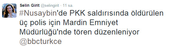 Gezi olaylarında kendi ülkesini karalamaktan çekinmeyen BBC muhabiri Selin Girit, Türkiye karşıtı propagandasına devam ediyor. Girit son olarak devletin Cizre'de katliam yaptığını yazmıştı. Girit şimdi de Mardin'de kalleş saldırıda şehit olan polisler için düzenlenen törene katıldı. Törenden fotoğraf paylaşan Girit, "Nusaybin'de PKK saldırısında öldürülen üç polis için Mardin Emniyet Müdürlüğü'nde tören düzenleniyor" notunu düşerken, polislerimize 'şehit' diyemedi.
