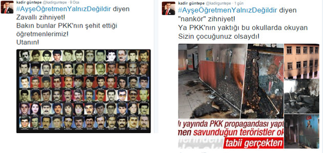 - "#AyşeÖğretmenYalnızDeğildir diyen Zavallı zihniyet! Bakın bunlar PKK'nın şehit ettiği öğretmenlerimiz! Utanın!"