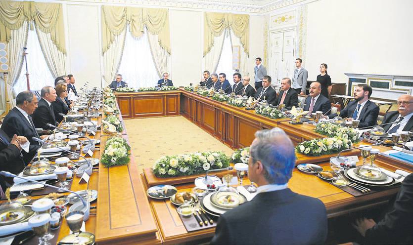 Cumhurbaşkanı Erdoğan ve Vladimir Putin, Rus uçağının düşürülmesinden 259 gün sonra St. Petersburg şehrinde bir araya geldi. Ardından Türk ve Rus heyetlerinin hazır bulunduğu dostluk yemeğine geçildi. Yemekte konukların önünde iki liderin tokalaşma karelerinin olduğu tabaklar konuldu. Görüşmede Erdoğan'a, Enerji ve Tabii Kaynaklar Bakanı Berat Albayrak, Dışişleri Bakanı Mevlüt Çavuşoğlu ile Cumhurbaşkanlığı Sözcüsü İbrahim Kalın eşlik etti.