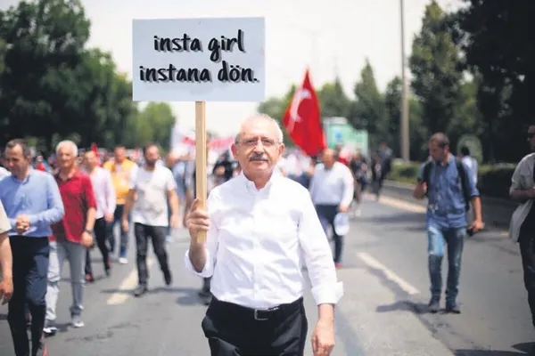Kemal Kılıçdaroğlu, ‘Adalet’ yazılı pankartı kaptı. Ankara’dan İstanbul’a yürüyüş başlattı. Dura kalka yol aldı! Adımları ise mizah alemine renk kattı! Sosyal medya birbirinden ilginç mesajlarla çalkalandı... Kiminde Badi Ekrem kiminde ise simitçi vardı...