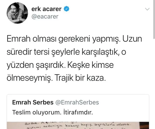 Aynı aileden baba ve kız olmak üzere 2 kişinin ölümüne, annenin de ağır yaralanmasına sebep olan ancak, alkol/uyuşturucu etkisinin geçmesini beklerken 6 gün boyunca saklanan Emrah Serbes'in eski twitlerinde "Alkol yasak, sigara yasak, 3 çocuk yapmamak yasak, ne serbest bu ülkede? Bir tek ben serbestim heralde Emrah Serbes olarak." diyordu.
