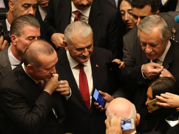 Bahçeli'nin yakasındaki Türk bayrağı rozetine işaret eden Erdoğan, "Renkleri değiştirmişsiniz" dedi. Bahçeli de elbiselere göre değiştiğini söyledi. Daha sonra sohbete TBMM Başkanı İsmail Kahraman ve Başbakan Binali Yıldırım da eşlik etti.