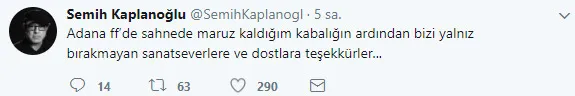 Ayrıca kişisel twitter hesabından konuyla ilgili açıklama yapan Semih Kaplanoğlu kendisine destek olanlara teşekkür etti. Kaplan "Adana ff'de sahnede maruz kaldığım kabalığın ardından bizi yalnız bırakmayan sanatseverlere ve dostlara teşekkürler..." dedi.