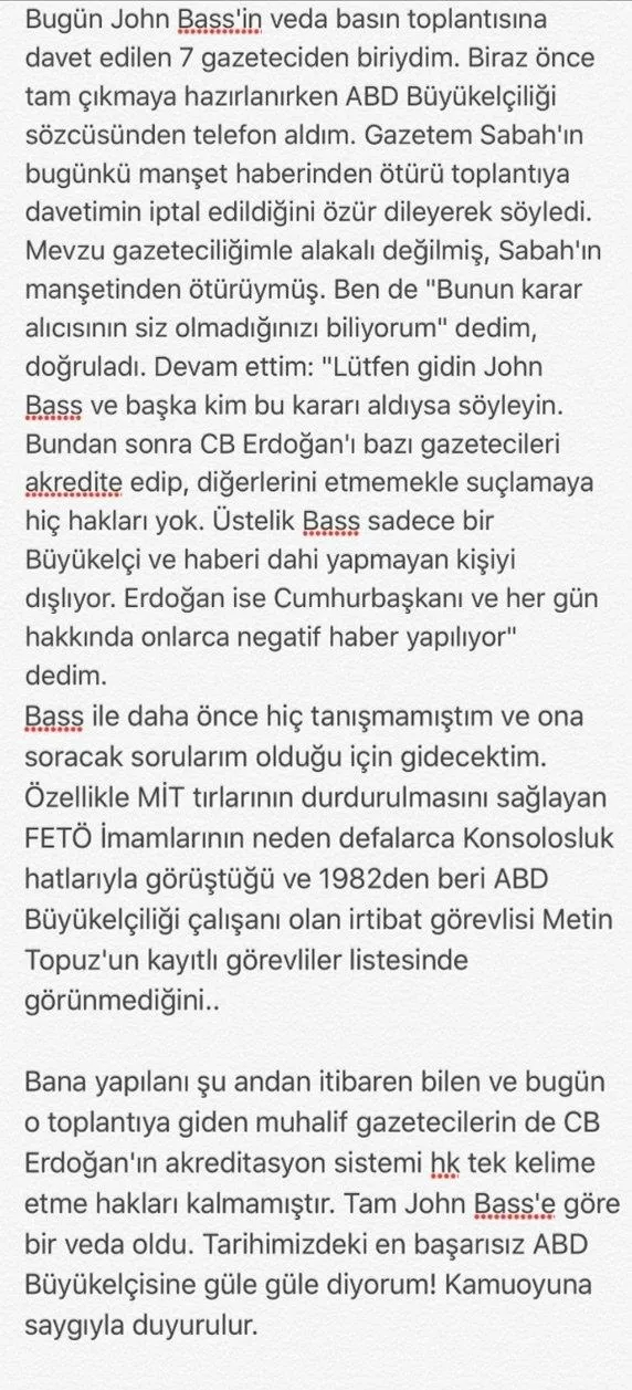 Hilal Kaplan kişisel twitter hesabından ABD Büyükelçiliği'nde John Bass'ın vedası için bugün yapılacak toplantıya gitmek üzereyken SABAH'ın bugünkü manşetinden dolayı aranarak davetinin iptal edildiğinin bildirildiğini açıkladı.