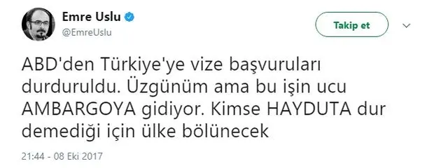 ABD'nin skandal vize kararı sonrası ABD'ye kaçan tescilli teröristler Emre Uslu ve Adem Yavuz Aslan başta olmak üzere firari FETÖ'cüler sosyal medya üzerinden CHP'liler gibi harekete geçerek Türkiye karşıtlığında birleşti. İşte o tweetler