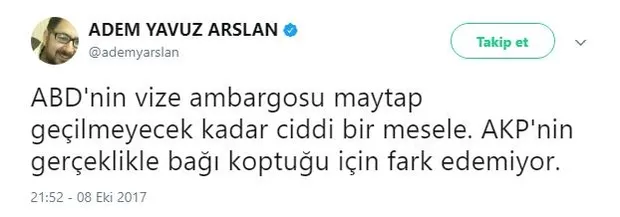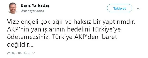 Sosyal medya hesabından yaptığı paylaşımda 'Vize engeli çok ağır ve haksız bir yaptırımdır. AKP'nin yanlışlarının bedelini Türkiye'ye ödetemezsiniz. Türkiye AKP'den ibaret değildir' dedi. Yarkadaş'a tepkiler çığ gibi büyüyor..