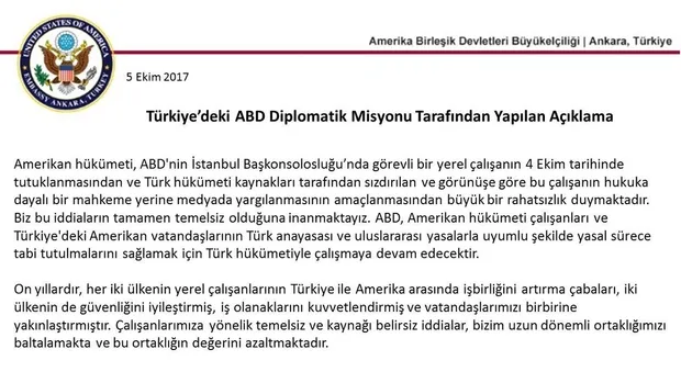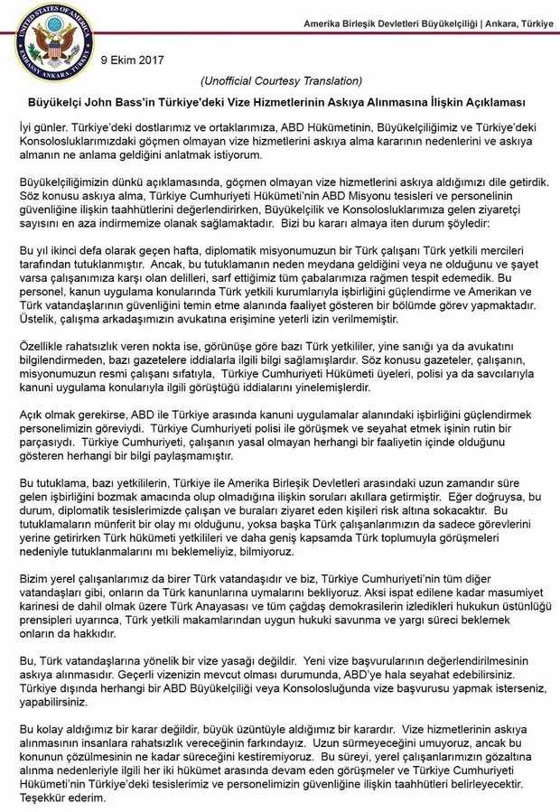 Bu kolay aldığımız bir karar değildir, büyük üzüntüyle aldığımız bir karardır. Vize hizmetlerinin askıya alınmasının insanlara rahatsızlık vereceğinin farkındayız. Uzun sürmeyeceğini umuyoruz, ancak bu konunun çözülmesinin ne kadar süreceğini kestiremiyoruz. Bu süreyi, yerel çalışanlarımızın gözaltına alınma nedenleriyle ilgili her iki hükümet arasında devam eden görüşmeler ve Türkiye Cumhuriyeti Hükümeti'nin Türkiye'deki tesislerimiz ve personelimizin güvenliğine ilişkin taahhütleri belirleyecektir. Teşekkür ederim.