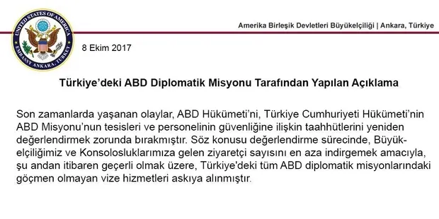 Büyükelçiliğimizin dünkü açıklamasında, göçmen olmayan vize hizmetlerini askıya aldığımızı dile getirdik. Söz konusu askıya alma, Türkiye Cumhuriyeti Hükümeti'nin ABD Misyonu tesisleri ve personelinin güvenliğine ilişkin taahhütlerini değerlendirirken, Büyükelçilik ve Konsolosluklarımıza gelen ziyaretçi sayısını en aza indirmemize olanak sağlamaktadır. Bizi bu kararı almaya iten durum şöyledir: