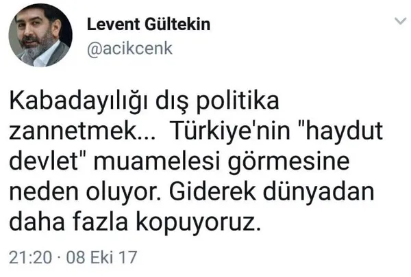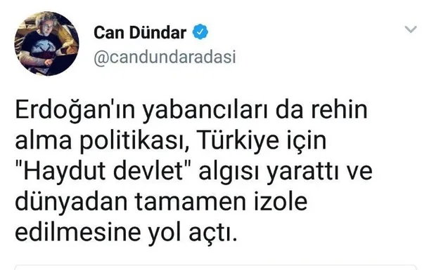 Üç FETÖ'cünün tweetlerinde ortak nokta ise Türkiye'yi 'haydut devlet' olarak göstermeleriydi. Skandal karar sonrası örgüt mensuplarına algı oluşturmaları için talimat gitmiş olsa gerek ki FETÖ'cüler aynı kavramları kullanarak saldırdı.