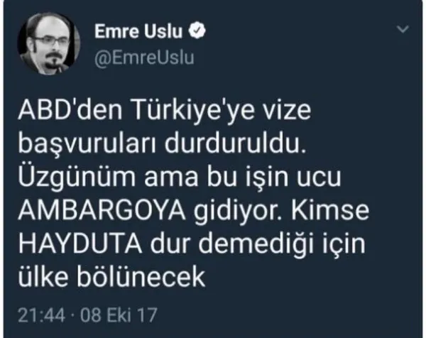 Pensilvanya'daki teröristbaşı Gülen'in tetikçileri sosyal medya üzerinden hareket geçti. Ajanları yakalanınca panikleyen ABD'nin, Türkiye'ye uyguladığı vize yasağı sonrası FETÖ mensupları da algı operasyonuna başladı. Emre Uslu, Can Dündar ve Levent Gültekin gibi isimler aynı kavramları kullanarak tweet attılar.