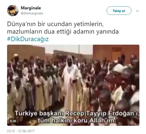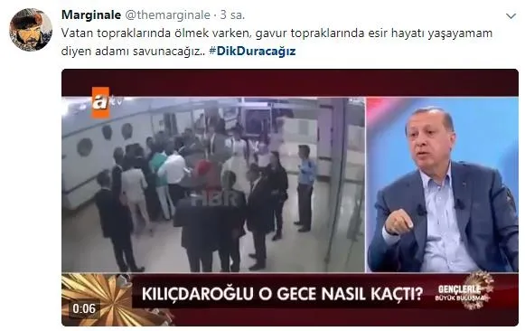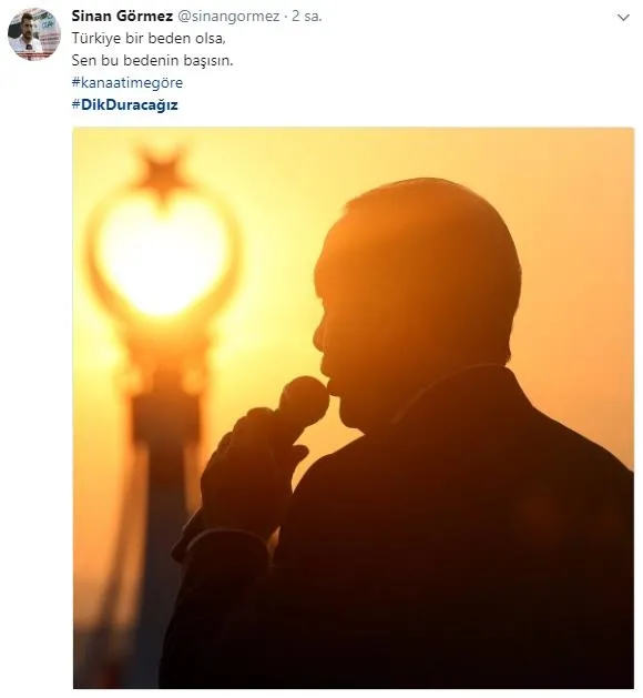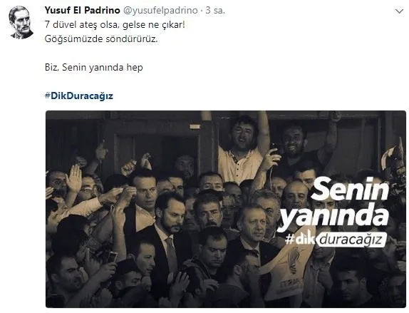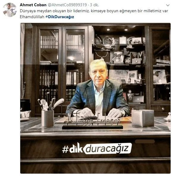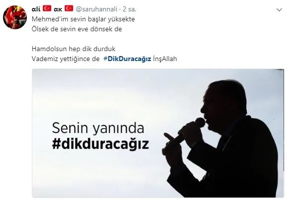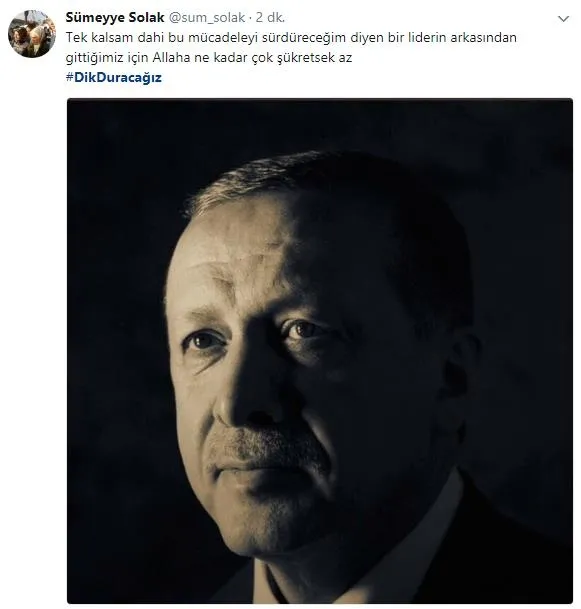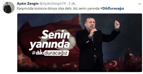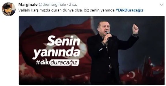 Cumhurbaşkanı Erdoğan'a destek için sosyal medya üzerinden #DikDuracağız hashtagiyle yanındayız mesajı verildi. Twitter kullanıcıları "7 düvele karşı yanındayız" diye yazdı. İşte o tweetlerden bazıları: