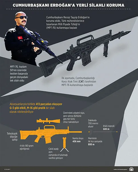 Cumhurbaşkanı Recep Tayyip Erdoğan'ın koruma ekibi, Türk mühendislerince tasarlanan Milli Piyade Tüfeği'ni (MPT-76) kullanmaya başladı.