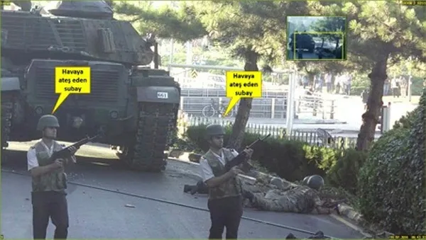Saat 06.43'te silahlı bir subayın, mevzilendiği nöbet kulübesinden vatandaşların darbecileri protesto ettiği İnönü Bulvarı yönüne nişan alarak 6 kez ateş açtığı, bu sırada kısa kollu günlük üniformalı, hücum yelekli, silahlı 2 subayın da destek için bu bölgeye gittikleri görülüyor.