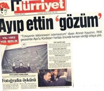 Gazetenin iddiasına göre Ahmet Kaya, Berlin'de Kürt İşadamları Derneği'nin düzenlediği bir gecede Türkiye'ye kin kusmuştu. Sonraki manşette ise Ahmet Kaya için Ayıp Ettin Gözüm manşetini atan Hürriyet, onu Apo'lu Kürdistan haritası önünde konser vermekle itham etti.