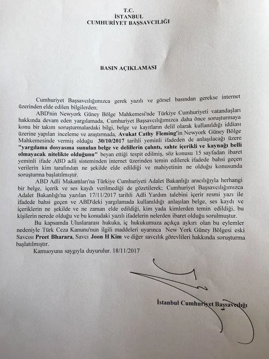 Bu kapsamda Uluslararası hukuka, iç hukukumuza açıkça aykırı olan bu eylemler nedeniyle Türk Ceza Kanunu'nun ilgili maddeleri uyarınca New York Güney Bölgesi eski Savcısı Preet Bharara, savcı Joon H Kim ve diğer savcılık görevlileri hakkında soruşturma başlatılmıştır. Kamuoyuna saygıyla duyurulur.'
