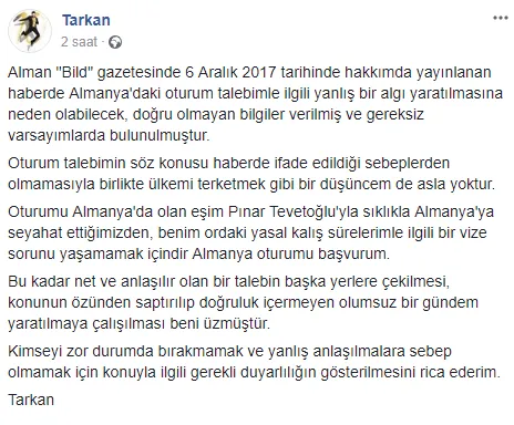 "Alman "Bild" gazetesinde 6 Aralık 2017 tarihinde hakkımda yayınlanan haberde Almanya'daki oturum talebimle ilgili yanlış bir algı yaratılmasına neden olabilecek, doğru olmayan bilgiler verilmiş ve gereksiz varsayımlarda bulunulmuştur.
