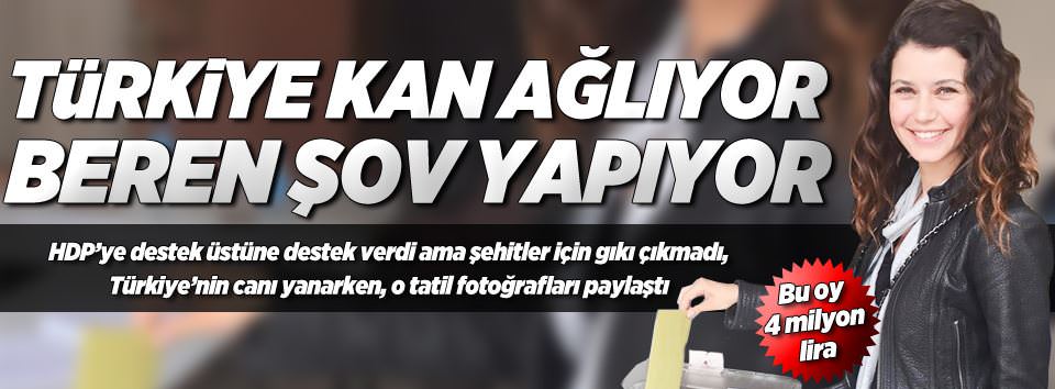 Türkiye'nin dört bir yanında düzenlenen terör protestolarının en ilginci, önceki akşam Sarıyer'de gerçekleşti. Bir grup, HDP'ye oy verdiği iddia edilen Beren Saat'i protesto etmek için 'akıl dışı' bir yol izledi. Öfkeli grup, Saat'in rol aldığı 'Aşk-ı Memnu' dizisinin çekildiği villanın önünde toplanıp "Beren Saat'e inat teröre hayır" diye sloganlar attı. Grup, yarım saatin ardından dağıldı. Bu protestoyu duyan Kenan Doğulu, eşi için iyice endişelendi.