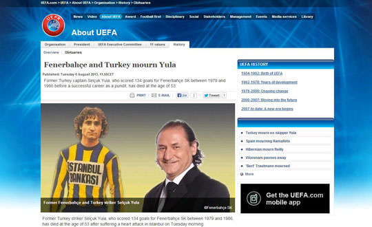 UEFA, Fenerbahçe'nin efsanevi forveti Selçuk Yula'nın vefatını, "Fenerbahçe ve Türkiye Yula'ya ağlıyor" manşetiyle duyurdu.