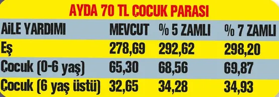 Memurlara eş için aylık 278,69, 0-6 yaş çocuk için 65,30, 6 yaş üstü çocuk için de 32,65 lira veriliyor. Eşi çalışmayan, 0-6 yaş arası 2 çocuğu olan aylık 409,29 lira alıyor. Bu tutar, artış yüzde 5 olursa 429,74 liraya, yüzde 7 olursa 437,94 liraya çıkacak.