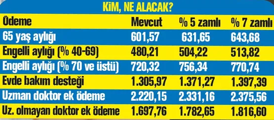 601,57 lira olan 65 yaş aylığı, yüzde 5'lik artışa göre 631,65, yüzde 7 zamma göre 643,68 liraya çıkacak.
