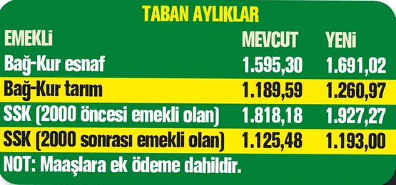 Yüzde 5'lik artışa göre, en düşük memur emeklisi maaşı 119 lira artışla 2 bin 498 liraya yükselecek. Zam yüzde 7'ye ulaşırsa da, en düşük aylık 167 lira yükselişle 2 bin 546 liraya ulaşacak. SSK ve Bağ-Kur emeklilerinin zammı yüzde 6 olarak gerçekleşirse en düşük maaş esnaf emeklilerinde bin 691 liraya çıkacak. Bağ- Kur tarım emeklilerinde de taban maaş bin 260 liraya ulaşacak. SSK'lılarda ise en düşük maaş, 2000'den önce emekli olanlarda bin 927, 2000'den sonra emekli olanlarda bin 193 liraya yükselecek.