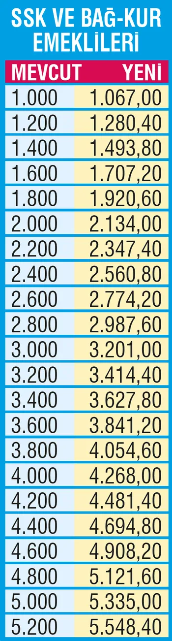 TAKVİM, bu tahmine göre SSK ve Bağ-Kur emeklilerinin yeni maaşlarını hesapladı. Hazırladığımız tabloya bakan emekliler, Temmuz'dan itibaren ceplerine girecek para konusunda fikir sahibi olabilecek. Eğer yüzde 6.7'lik tahmin gerçekleşirse, SSK ve Bağ-Kur emeklilerinin maaşlarında