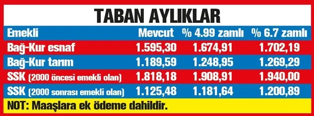 Merkez Bankası'nın yaptığı son beklenti anketine göre ise zam oranı yüzde 6.7'yi bulacak. Bu orana göre en düşük maaş; esnaf emeklilerinde bin 702 lira 19 kuruşa, Bağ-Kur tarım emeklilerinde bin 269 lira 29 kuruşa, 2000'den önce emekli olan SSK'lılarda bin 940 liraya, 2000'den sonra emekli olan SSK'lılarda bin 200 lira 89 kuruşa ulaşacak.