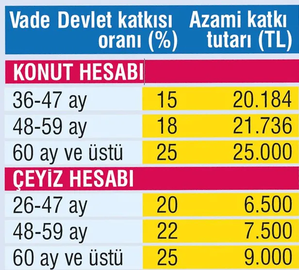 ✖ Ödeme süresi 36-47 ay arası olanlar 6 bin 500, 48-59 ay arası 7 bin 500, 60 ay ve üzeri olanlar 9 bin liraya varan devlet katkısı alabilecek.