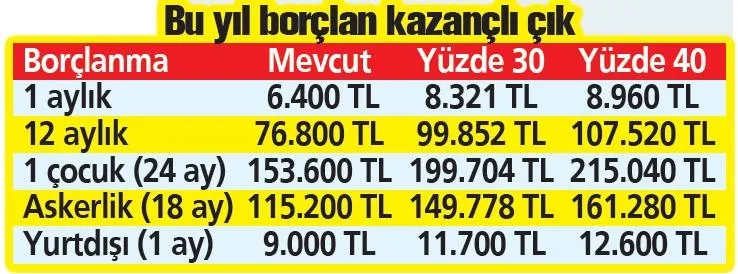 Kadınlar ise sigortalı olduktan sonra dünyaya gelen üç çocuk için borçlanabiliyor ve her çocuk için 720 gün olmak üzere toplam 2160 gün satın alabiliyor. Gurbetçiler ise yurt dışında çalıştıkları günleri satın alabiliyor. Bu borçlanmalar için ödenecek paralar uygulamadaki brüt asgari ücrete göre belirleniyor. Bir aylık borçlanma için en az mevcut brüt asgari ücretin yüzde 32'si ödeniyor. Yurtdışı borçlanmalarda bu oran yüzde 45'e çıkıyor. Dolayısıyla asgari ücrete gelecek bir zam yapılacak borçlanma miktarlarını da artırıyor. Örneğin bu yıl 12 aylık borçlanma miktarı 20.002 liralık brüt asgari ücrete göre 76.807 lira olarak hesaplanıyor. Asgari ücrete gelecek yüzde 30-40 zam düşünüldüğünde bu rakam 99.849 TL-107.530 TL gibi bir rakama çıkacak. Gurbetçiler için bu fark daha da büyüyecek. Bakıldığında bu yıl 31 Aralık'a kadar yapılacak borçlanma her durumda asgari ücret artacağı için daha kazançlı olacak.