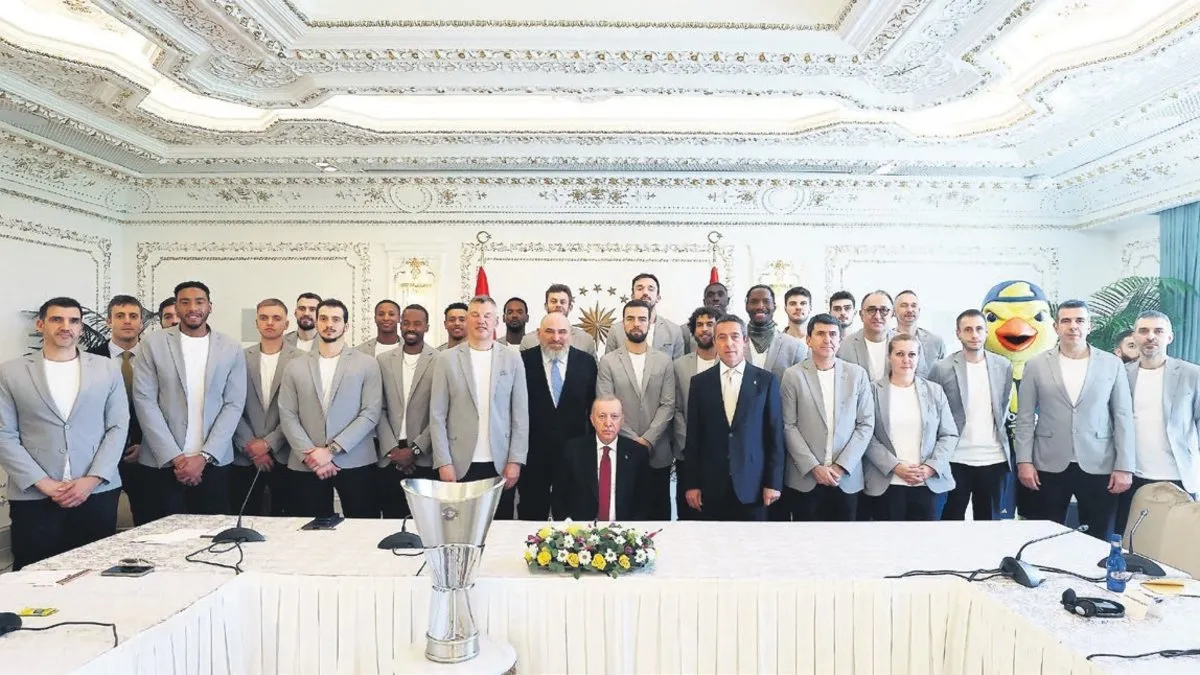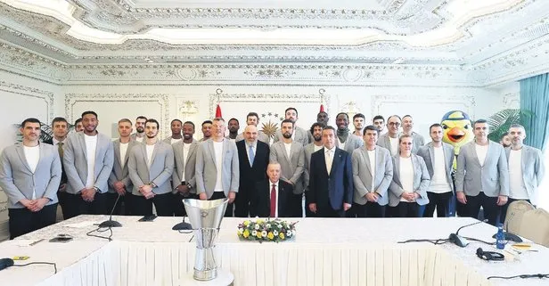 Takım kaptanı Melih Mahmutoğlu, Başkan Erdoğan'a forma, Fenerbahçe Beko'nun maskotu Yellow ise peluş Yellow hediye etti. Kabulde, Gençlik ve Spor Bakanı Osman Aşkın Bak da hazır bulundu.