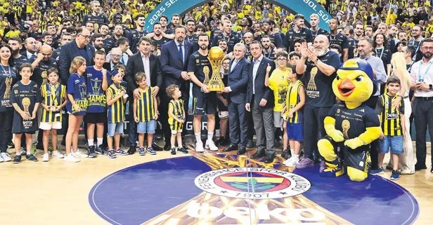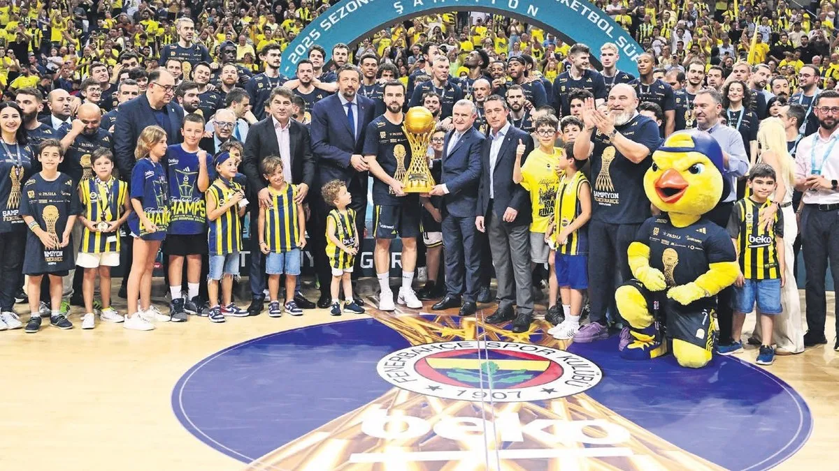 Fenerbahçe 12. lig şampiyonluğuna ulaşırken kupayı bakan Osman Aşkın Bak ile TBF Başkanı Hidayet Türkoğlu'nun elinden aldılar.