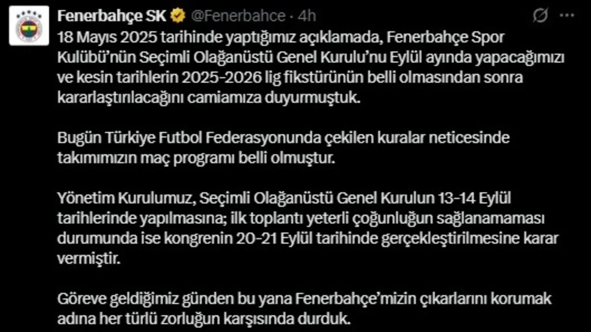 F.Bahçe, seçimli olağanüstü genel kurulun 13-14 Eylül tarihlerinde, çoğunluğun sağlanamadığı durumda ise 20-21 Eylül tarihlerinde yapılacağını açıkladı.