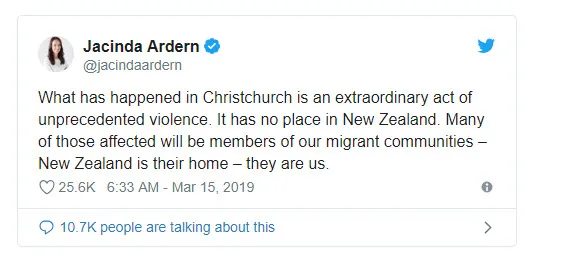 Canlı yayında basın toplantısı düzenleyen Ardern, "Polisler güvenliğinizi sağlayabilmek için görevlerini yapmaya devam edecekler. Yetkililer ve imamla görüştüm. Yeni Zelanda bir mesaj paylaşmamı bekliyor tabii ki, düşüncelerimiz ve dualarımız bu insanlarla birlikte. Birçokları için burası onların doğum yeri değildi. Bir şekilde, aile kurmak, yaşam kurmak, yaşamak için burayı seçtiler. Biz nefretin kucak açtığı bir yer değiliz, aşırılığın yuvası değiliz. Bu saldırının yapılmış olması bizim hiç terörle bağımız olmaması, her türlü dine, etnik çeşitliğe sahip bir ülkeyiz biz ve bugünün devamında insanlar bizim yardımseverliğimizi, dostluğumuzu, dayanışmamızı görecek.
