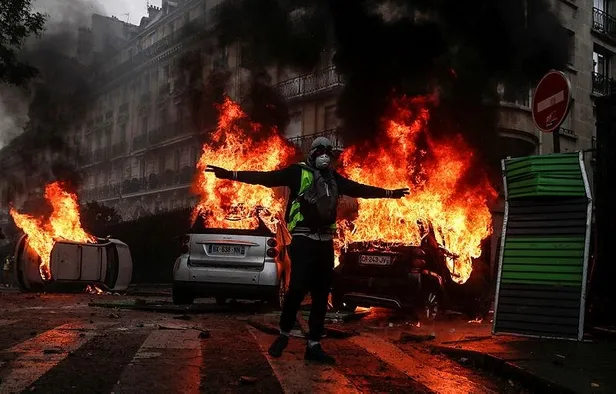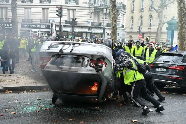 Başkent Paris'in Champs-Elysees Caddesi çevresinde 1 Aralık'ta düzenlenen, binlerce kişinin katıldığı gösteride polisin eylemcilere sert müdahalesi, sokaklarda araçların ve çöp bidonlarının yakılması, iş yerlerinin yağmalanması, sık aralıklarla ses bombalarının patlatılması ve alevlerin yükselmesi kenti "kaosa" sürüklemişti.