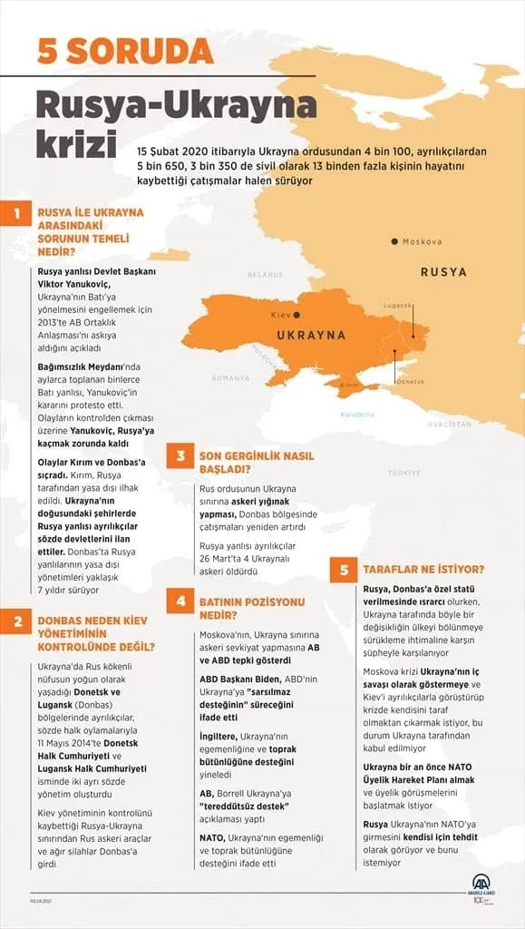 2014'ten bu yana devam eden Rusya-Ukrayna krizi, Ukrayna'nın doğusundaki Donbas bölgesinde 26 Mart'ta 4 Ukrayna askerinin ölmesi ve Rus ordusunun Ukrayna sınırlarındaki hareketliliği nedeniyle tekrar dünya gündemine geldi. Krizin nasıl geliştiği, tarafların ne istediği, krizin neden çözülemediği ve krize ilişkin son durum derlendi.