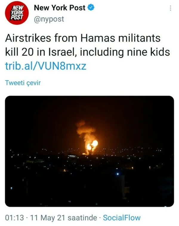 New York Post gazetesi de çirkin bir manipülasyona imza attı. İşgalci İsrail'in 9'u çocuk 20 Filistinliyi katletmesi haberini, "Hamas kuvvetlerinin hava saldırıları sonucu 9'u çocuk olmak üzere 20 İsrailli öldü" şeklinde paylaştı. Haber, gösterilen tepkilerin ardından kaldırıldı.