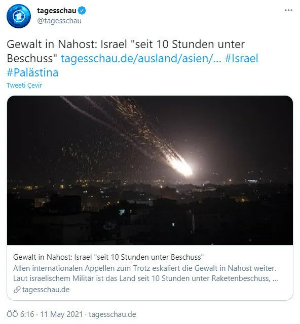 Alman devlet medyası Tagesschau, Müslümanların kutsalına saldıran, hedef gözetmeden Filistinli sivillerin üzerine bomba yağdıran İsrail'in vahşetini görmezden gelerek "İsrail 10 saattir ateş altında başlığı" attı.