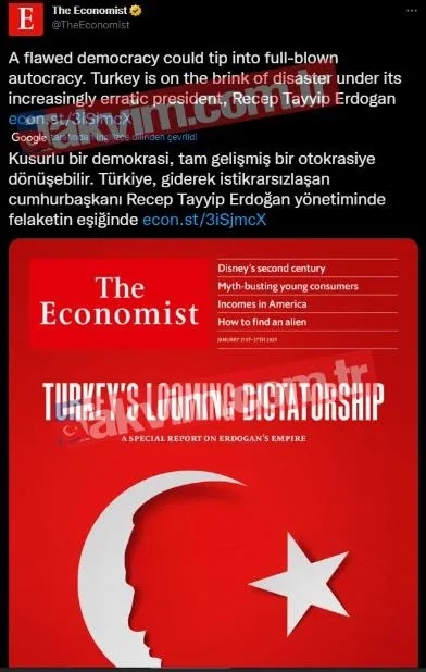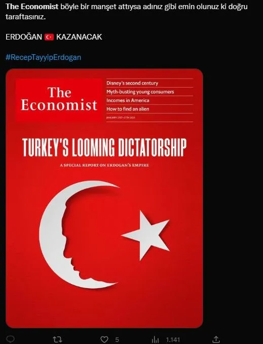 Londra merkezli The Economist'in skandal manşeti ve haberine sosyal medyadan tepki yağdı. Sosyal medyada The Economist dergisinin 2017 yılında yaptığı haberi paylaşan vatandaşlar Londra merkezli derginin yeniden kirli bir oyuna imza attığını ve bunun her seçimde tekrarlandığına dikkat çekti.