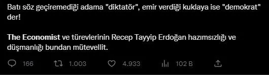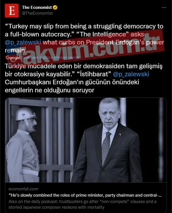 Sosyal medyadan paylaşılan haberde, "Kusurlu bir demokrasi, tam gelişmiş bir otokrasiye dönüşebilir. Türkiye, giderek istikrarsızlaşan Cumhurbaşkanı Recep Tayyip Erdoğan yönetiminde felaketin eşiğinde" şeklinde Başkan Erdoğan'ı hedef alan ifadelere yer verildi.