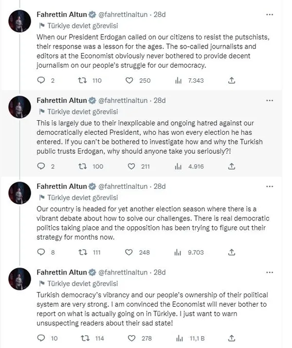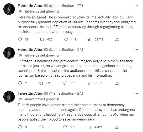 Cumhurbaşkanlığı İletişim Başkanı Fahrettin Altun, The Economist Dergisi hakkında, "Klişe sözler, dezenformasyon ve küstah bir propagandayla kendilerince Türk demokrasisinin sonunu ilan ediyorlar." ifadelerini kullandı.
