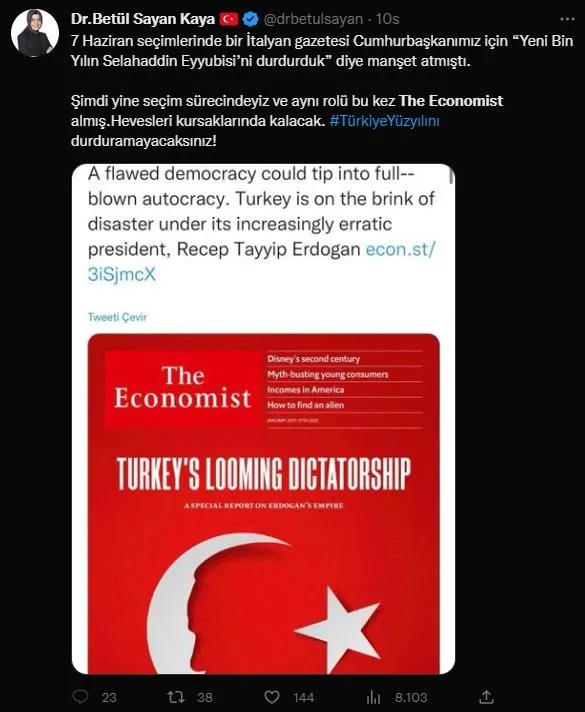 7 Haziran seçimlerinde bir İtalyan gazetesi Cumhurbaşkanımız için "Yeni Bin Yılın Selahaddin Eyyubisi'ni durdurduk" diye manşet atmıştı. Şimdi yine seçim sürecindeyiz ve aynı rolü bu kez The Economist almış.Hevesleri kursaklarında kalacak. #TürkiyeYüzyılını durduramayacaksınız!