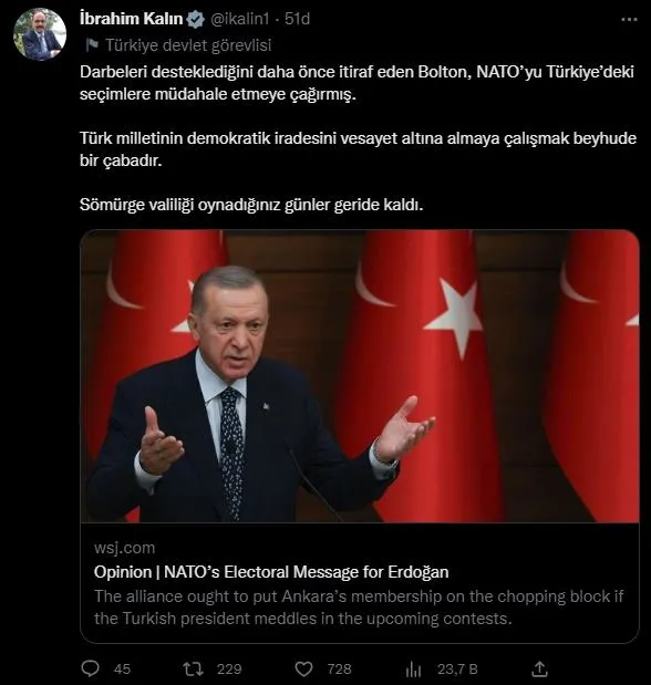 Kalın, sosyal medya hesabından yaptığı paylaşımda, daha önce darbeleri desteklediğini itiraf eden eski ABD Ulusal Güvenlik Danışmanı Bolton'un, NATO'yu Türkiye'deki seçimlere müdahale etmeye çağırdığını belirtti.