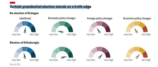 The Economist dergisinin araştırma ve analiz bölümü Economist Intelligence Unit tarafından yayınlanan Türkiye seçimleri hakkındaki raporda Kılıçdaroğlu'nun Başkan Erdoğan'ı yenmesinin çok zor olduğu belirtildi.