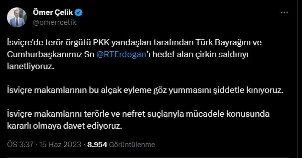 AK Parti Genel Başkan Yardımcısı ve Parti Sözcüsü Ömer Çelik, "İsviçre'de terör örgütü PKK yandaşları tarafından Türk bayrağını ve Cumhurbaşkanımız Sayın Recep Tayyip Erdoğan'ı hedef alan çirkin saldırıyı lanetliyoruz." ifadesini kullandı.