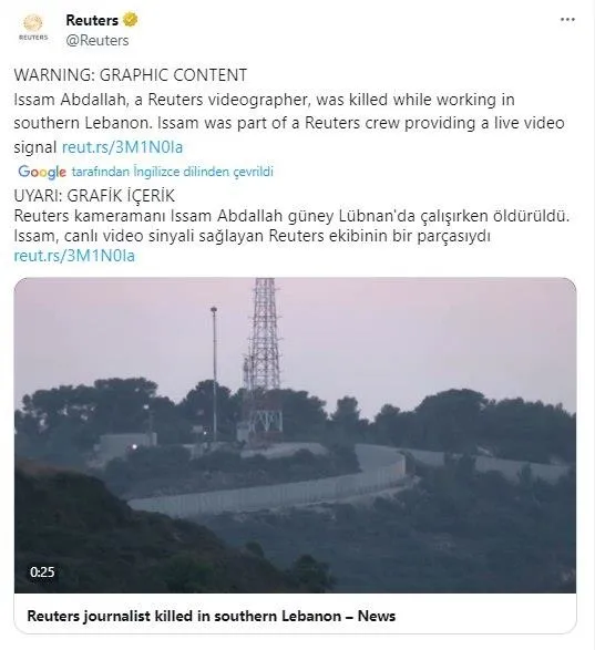 İşgalci İsrail polisinin Lübnan sınırında gazetecilerin olduğu aracı vurması sonucu Reuters fotoğrafçısı Issam Abdullah hayatını kaybetti. Reuters, yayımladığı mesajında Issam Abdullah'ın İsrail tarafından öldürüldüğüne değinmedi.