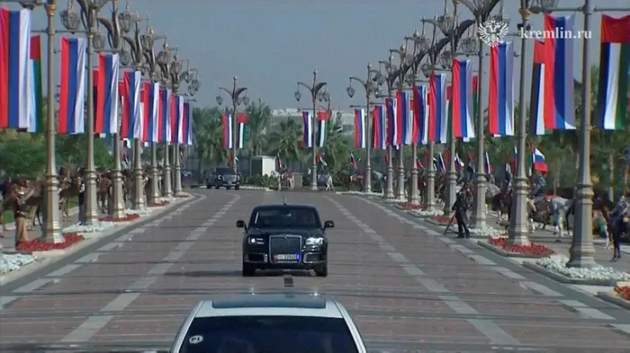 Rus savaş uçakları Putin'in yolculuğuna başkent Abu Dabi'ye ininceye kadar eşlik etmeyi sürdürdü. Putin Abu Dabi'de gökyüzünü Rus bayraklarının renklerine boyayan uçaklarla karşılandı.