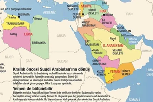 Suudi Arabistan'ın da kuzey, doğu, batı ve ortada bir Vahhabi devleti olarak 4 parçaya bölünmesi öngörülmüş. Sosyal sorunların yaşandığı, gençlerin yüzde 30'unun işsiz olduğu, azınlık ve kabilelerin baskı unsuru oluşturduğu ülkenin bütünlüğünü koruması zor görünüyor. Irak'ta Bağdat, Libya'da Misurata, Suriye'de ise Cebeli Düruz gibi kentlerin yapıları itibariyle birer şehir devleti oluşturma ihtimali ortaya çıkıyor.