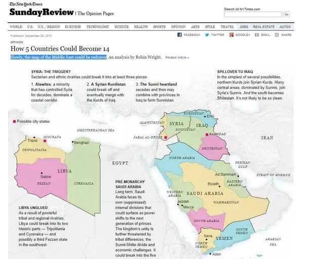 Amerikan New York Times gazetesi Ortadoğu'da 5 ülkenin parçalanacağı ve 14 yeni devletin ortaya çıkacağıyla ilgili bir harita yayımladı... New York Times’ta yayımlanan 28 Eylül 2013 tarihli Robin Wright imzalı bir analizde Ortadoğu’daki 5 devletin nasıl 14 çıkabileceği analizi çarpıcı detaylar içeriyor. “Yavaş yavaş Ortadoğu'nun haritası yeniden çizilebilir” denilerek yapılan analizde Suudi Arabistan, Yemen, Suriye, Irak, Libya gibi ülkelerin birkaç parçalandığı görülüyor.